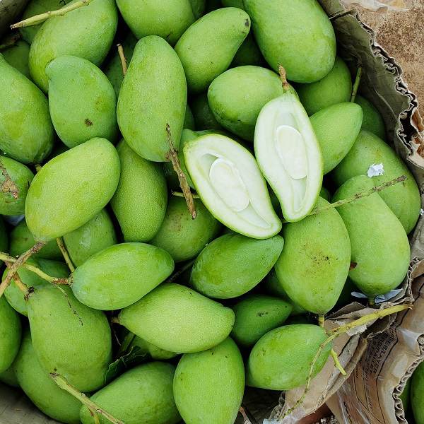 Xoài non rất ngon, ngọt và giòn khi ăn sống với mắm ruốc hoặc muối ớt, nhưng cũng khá ngon lành khi chế biến thành các món ăn khác như: xoài trộn chân gà, gỏi xoài tôm thịt, xoài ngâm chua ngọt, xoài non dầm bò khô,…